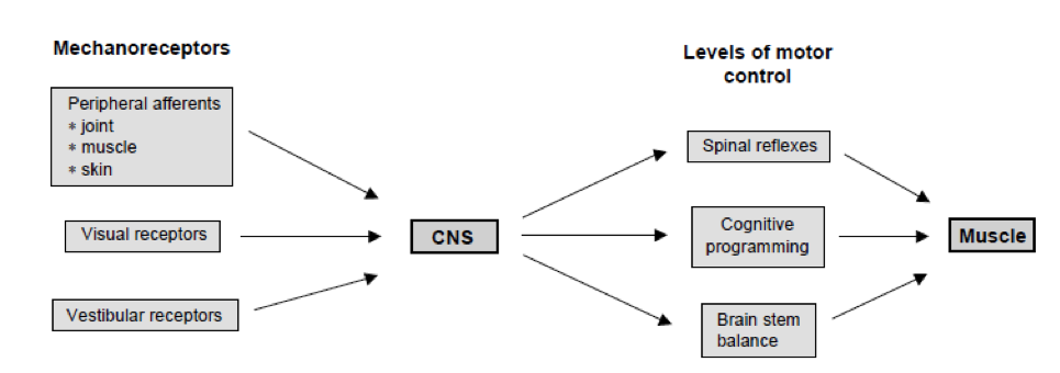 Balance and proprioception is controlled by our central nervous system and is controlled by 3 main sub-systems: the somatosensory (the nerves in our joints, tendons and muscles) the vestibular system (the inner ear canals) and the visual system. If any one of these subsystems is injured or working improperly, dysfunction in balance and function ensues.