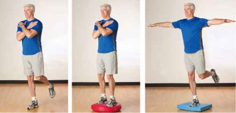 Single and double legs stance on unstable surfaces: A progression from the above exercises is adding in an unstable surface to stand on which increases the difficulty of balance required to maintain posture. Unstable surfaces can include: wobble boards, foam pieces, pillows and bosu balls. Again adding closed eyes to the below exercises further compounds the difficulty of the balance/proprioception exercises.